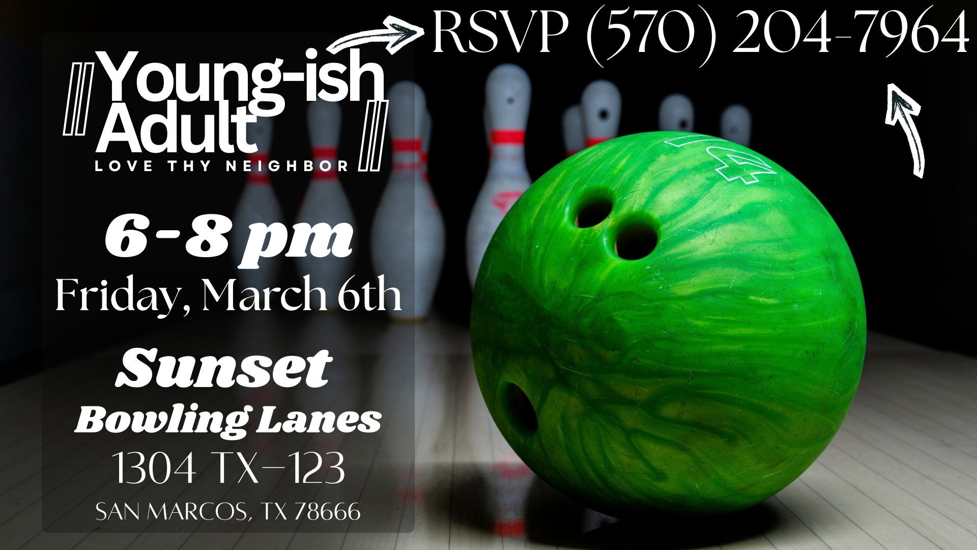 Young(ish!) Adults are going bowling! Join us at Sunset Bowling Lanes on Friday, March 6, from 6:00–8:00 pm for bowling, pizza, and good times. If you’re a young adult—or just young in spirit—you’re invited to come hang out with us.