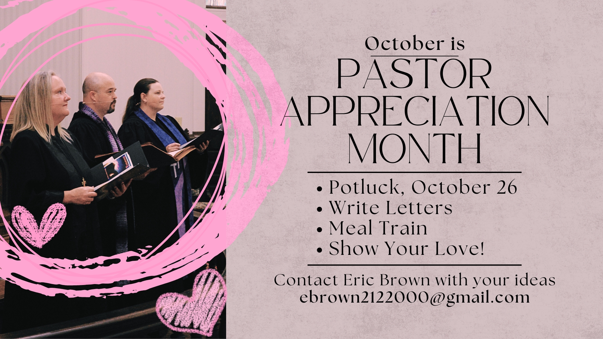 October is a busy month, but we want to take some time to let our pastors know how much we value them and appreciate all they do. We will hold a potluck in their honor on the 26th, but there are other ideas to show our love! If you feel so moved, write the pastors a personal letter, contact Eric if you want to join the meal train, or share your awesome ideas!
