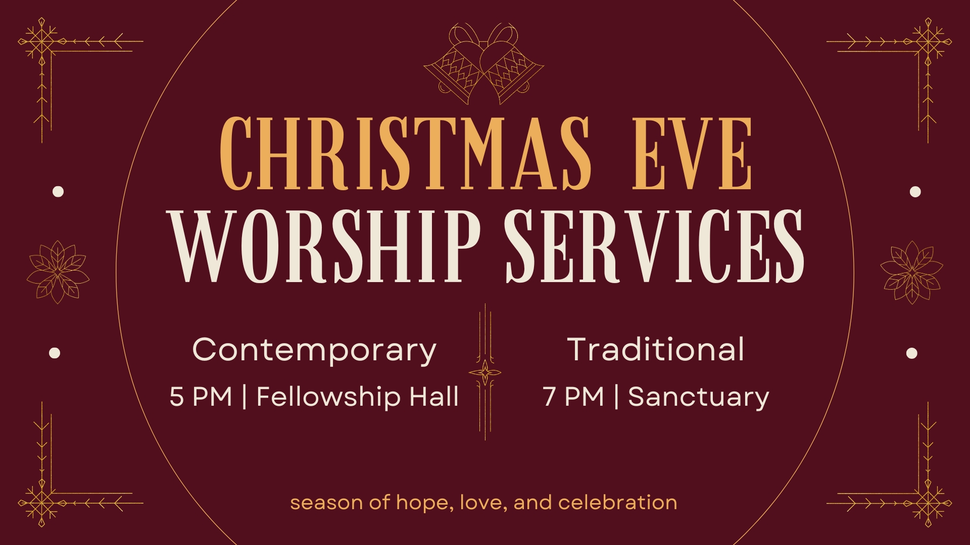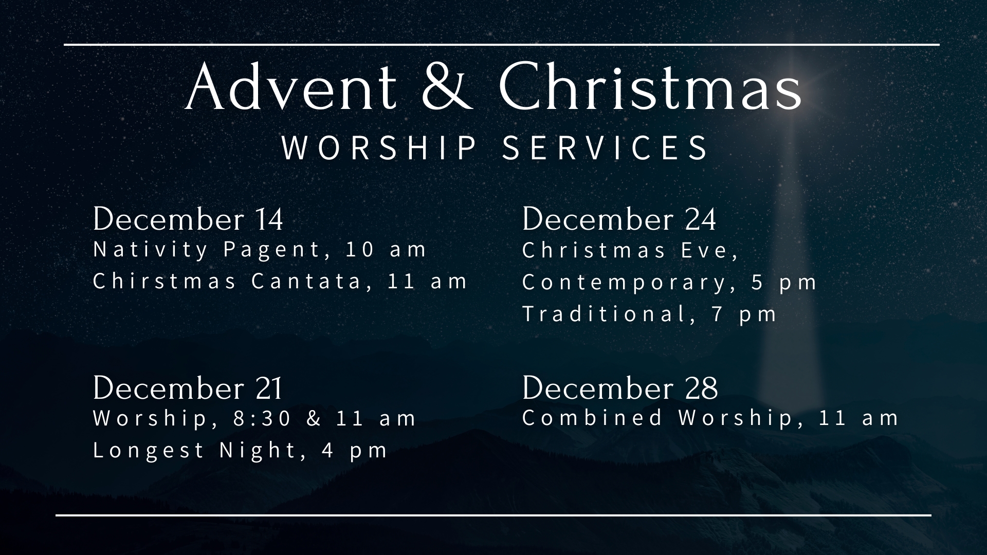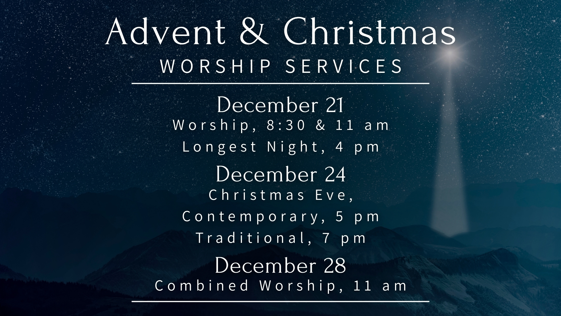 We invite you to celebrate the birth of Christ with us on Christmas Eve, December 24. Our contemporary service will be held at 5:00 PM in the Fellowship Hall, followed by our traditional service at 7:00 PM in the Sanctuary. Visiting family and friends are invited as well - all are welcome to worship and rejoice with us on this holy night.